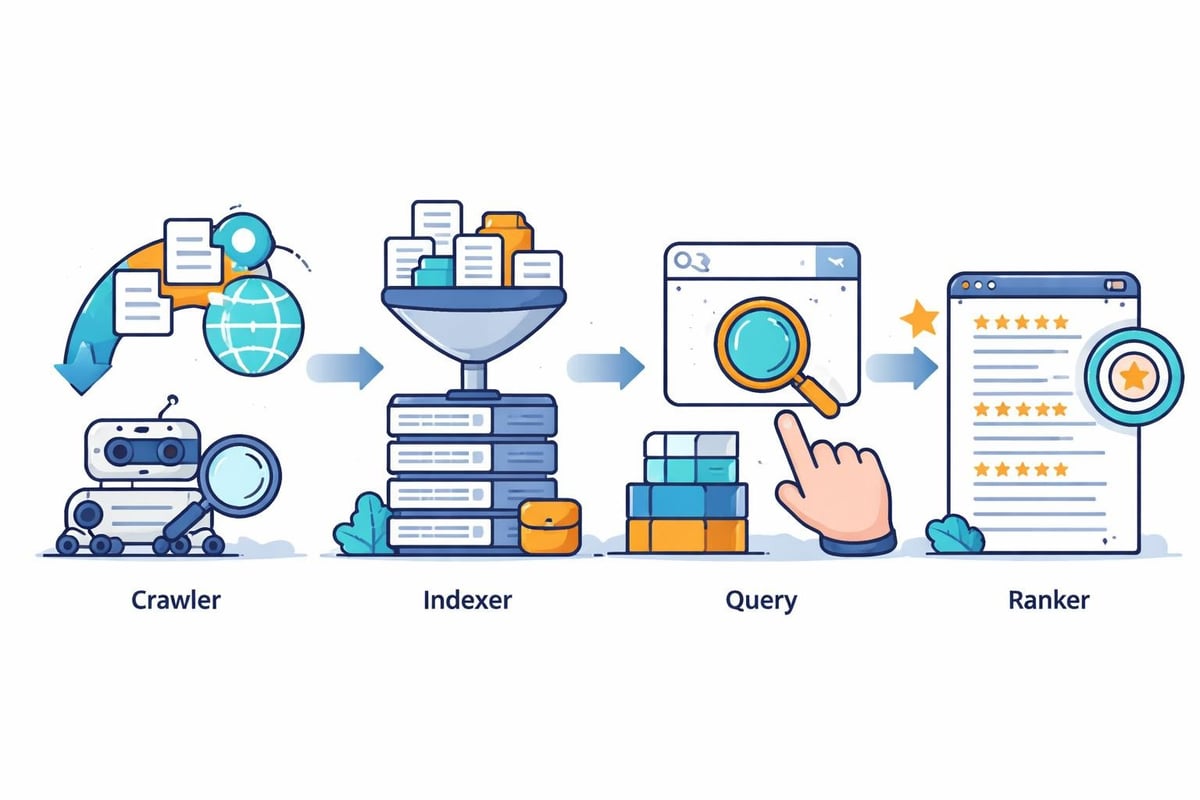 The crawler (or spider) systematically discovers and fetches documents from the web or your data sources. This component must handle rate limiting, respect robots.txt files, manage distributed crawling across thousands of machines, and prioritize which pages to crawl first. Effective search engine architecture relies on intelligent crawling strategies that balance comprehensiveness with efficiency.